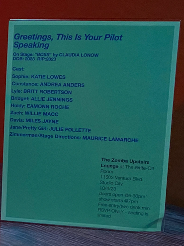 DEAD PILOT ON STAGE: "BOSS" BY CLAUDIA LONOW. HALF HOUR, SINGLE-CAM COMEDY. A MULTI-GENERATIONAL OFFICE COMEDY ABOUT TWO WOMEN, FRENEMIES...