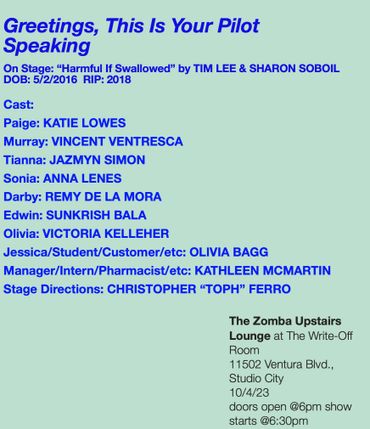 DEAD PILOT ON STAGE: "HARMFUL IF SWALLOWED" BY TIM LEE & SHARON SOBOIL. HALF HOUR, SINGLE-CAM COMEDY. A GROUP OF PANICKED PHARMACEUTICAL ...